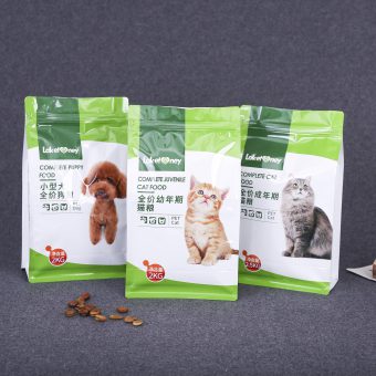宠物食品包装方式多种多样,但是于类宠物食品包装基本上采用材料,有纸塑复合、塑塑复合和铝塑复合包装袋。